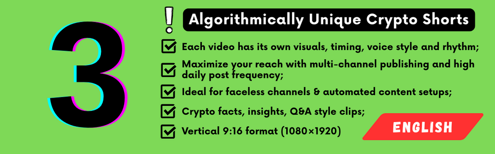 Gain instant access to a high-impact bundle of 3 unique Crypto-themed, English-language 9:16 vertical MP4 videos. Perfect for growing and monetizing your audience on YouTube Shorts, TikTok, Instagram Reels, and more. This content is ready-to-upload and includes a single-copy license, ensuring these videos are exclusive to you.